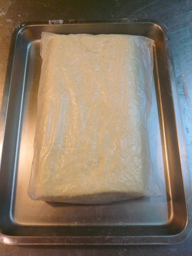 這是前幾天做的可頌,做法跟丹麥麵包相同,可頌的擀折是3次單摺,與丹麥麵包相同。擀折或用3折4次或434的做法,這次仍採習摜的4334的作法。酥脆麵糰,多使用簡單摺疊或三摺法,製作丹麥酥點需四回合製作。